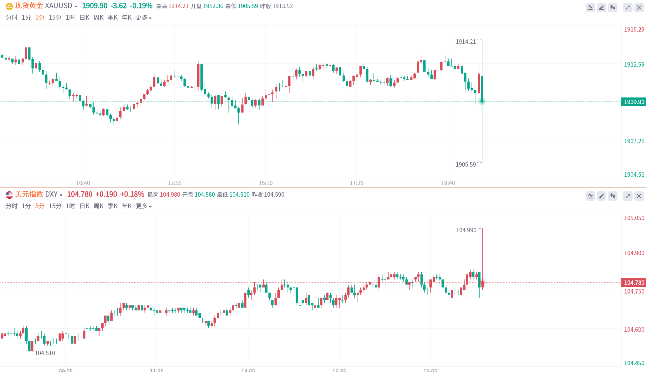 数据公布后,美元指数短线上扬超20点,现报104.98。现货黄金短线下挫近9美元,现报1906.49美元/盎司。美国国债收益率上升,10年期收益率上涨7.20个基点,达到4.336%。美国2年期国债收益率上涨4个基点,达到4.314%。