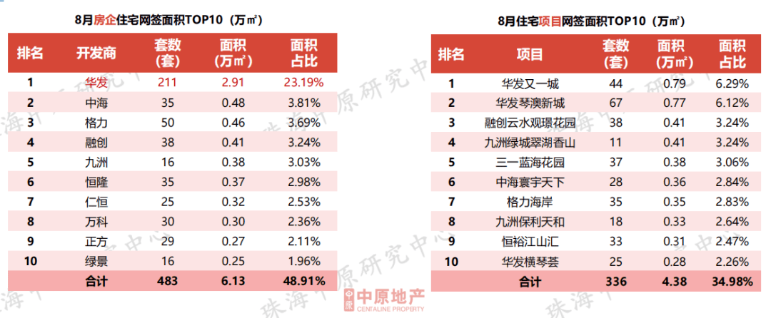 8月TOP10房企住宅签约面积占比48.91%,华发地产长期占据榜首位置,占全市23.19%;本月TOP10住宅项目签约4.38万㎡,占全市34.98%,华发又一城签约0.79万㎡重回项目签约排行榜榜首。