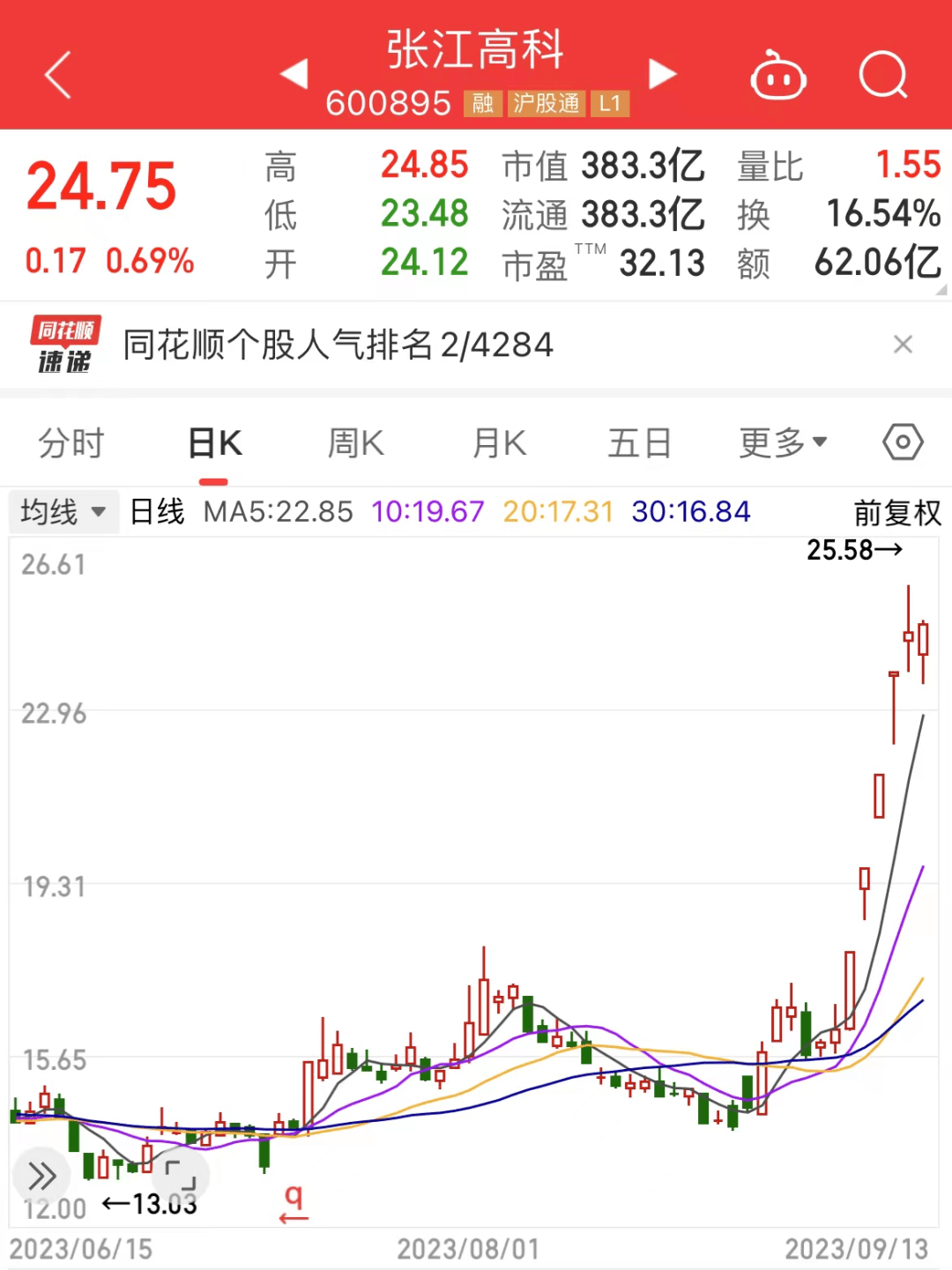 张江高科连续3日夺得成交额冠军