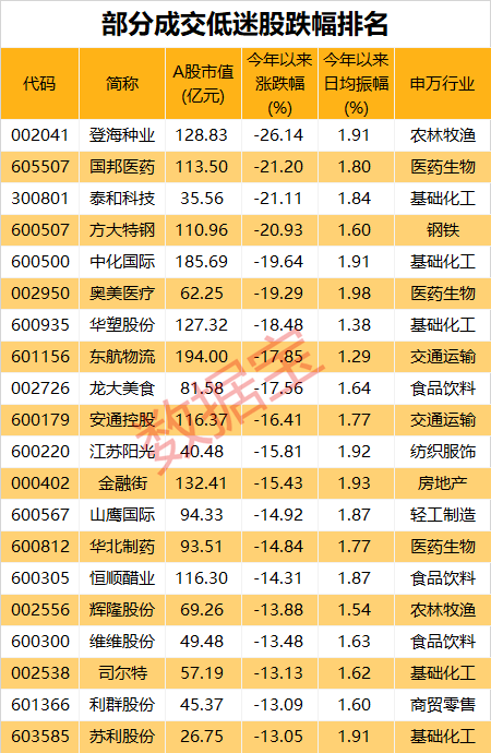 今年以来,超半数股票日均成交不足亿元,成交额低、换手率低、振幅低的股票都有哪些?