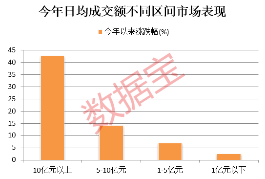 日均成交10亿元以上的股票今年平均上涨42.51%;日均成交介于5亿元至10亿元之间的股票年内平均上涨14.16%;日均成交不足1亿元的股票今年平均上涨2.51%,涨幅在所有区间中最低。