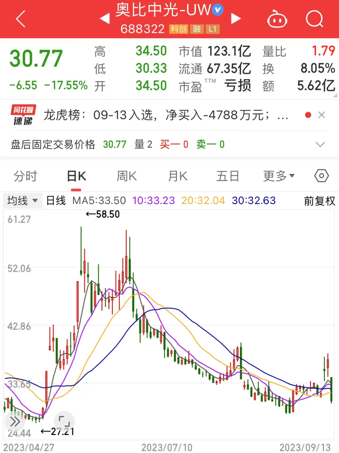 近两日华为、苹果先后发布手机新品,奥比中光-UW因3D视觉概念被热炒,周一到周二的2日涨幅达到16.84%。经历今日的大跌后,该股股价被打回原形。