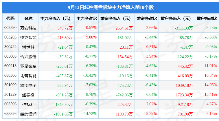 从资金流向上来看,当日线控底盘板块主力资金净流出3.29亿元,游资资金净流入2428.56万元,散户资金净流入3.04亿元。线控底盘板块个股资金流向见下表: