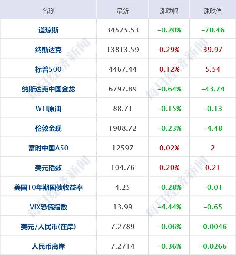 1、美股三大指数收盘涨跌不一,道指跌0.2%,纳指涨0.29%,标普500指数涨0.13%。热门科技股多数上涨,亚马逊、AMD涨超2%,英伟达、特斯拉、微软涨超1%,苹果跌超1%。云计算服务、区块链板块走高,甲骨文、AMD涨超2%。