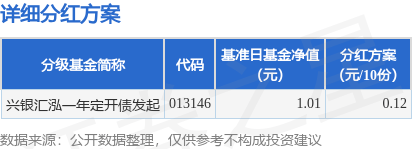 9月14日发布《兴银汇泓一年定期开放债券型发起式证券投资基金2023年第3次分红公告》。本次分红为本基金2023年度第3次分红。公告显示,本次分红的收益分配基准日为9月9日,详细分红方案如下:
