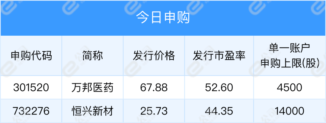 万邦医药、恒兴新材今日新股申购;