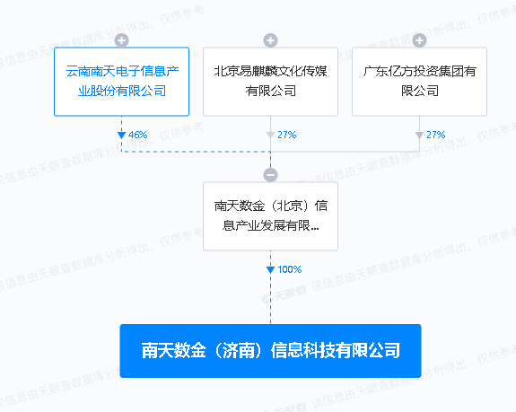 天眼查APP显示,近日,南天数金(济南)信息科技有限公司成立,注册资本1000万元,经营范围包含:人工智能应用软件开发;人工智能基础资源与技术平台;人工智能公共服务平台技术咨询服务;物联网技术研发等。天眼查股权穿透显示,该公司由南天信息旗下南天数金(北京)信息产业发展有限公司100%控股。