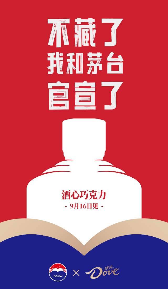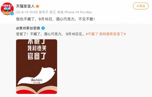 9月14日,茅台和德芙官宣联名海报表示“不藏了,酒心巧克力,9月16日见”,此消息一出冲上热搜。随即,天猫转发表示:我也不藏了,酒心巧克力,不见不散。