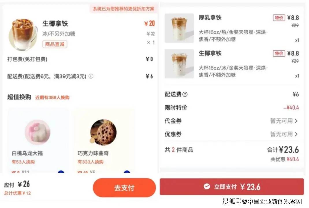 同样一杯生椰拿铁在小程序上下单,瑞幸一杯26的价格能买下库迪两杯,外卖软件满减和红包的搭配下也许会更便宜。