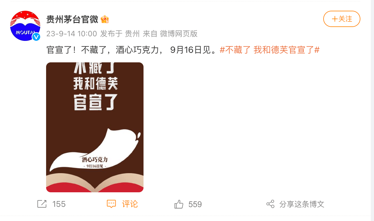 9月14日上午10时许,贵州茅台和德芙同时以海报官宣,将于9月16日推出酒心巧克力。