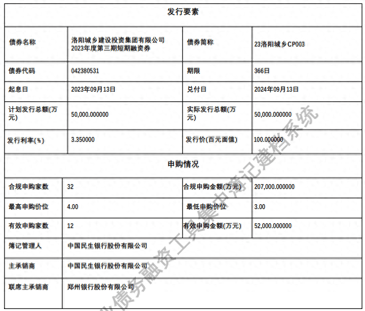 据悉,本期债券简称“23洛阳城乡CP003”,实际发行金额为5亿元,利率为3.35%,期限为366天;起息日为2023年9月13日,兑付日为2024年9月13日;簿记管理人/主承销商为民生银行,联席主承销商为郑州银行。