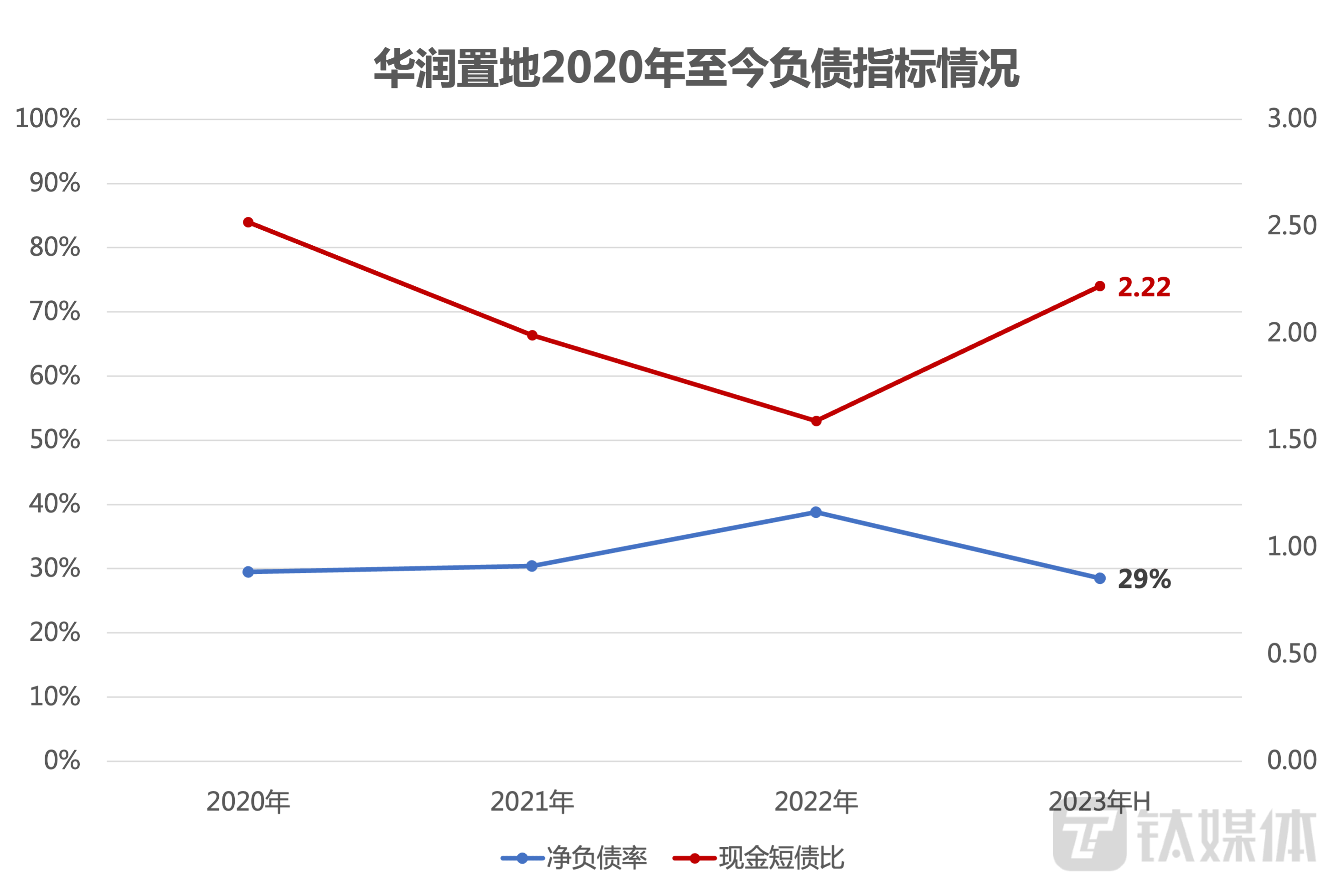 截至2023年上半年,华润置地现金及银行结存1293.4亿元,较上年末增加318.8亿元;现金短债比2.22,长短期债务比2.84,较2022年期末分别提升0.63和0.29。净负债率进一步降低10.3个百分点至28.5%,保持在行业低位;“三道红线”保持绿档达标,负债结构优化、财务水平稳健。截至上半年末,华润置地加权平均融资成本下降19个基点至3.56%,维持在行业较低水平。