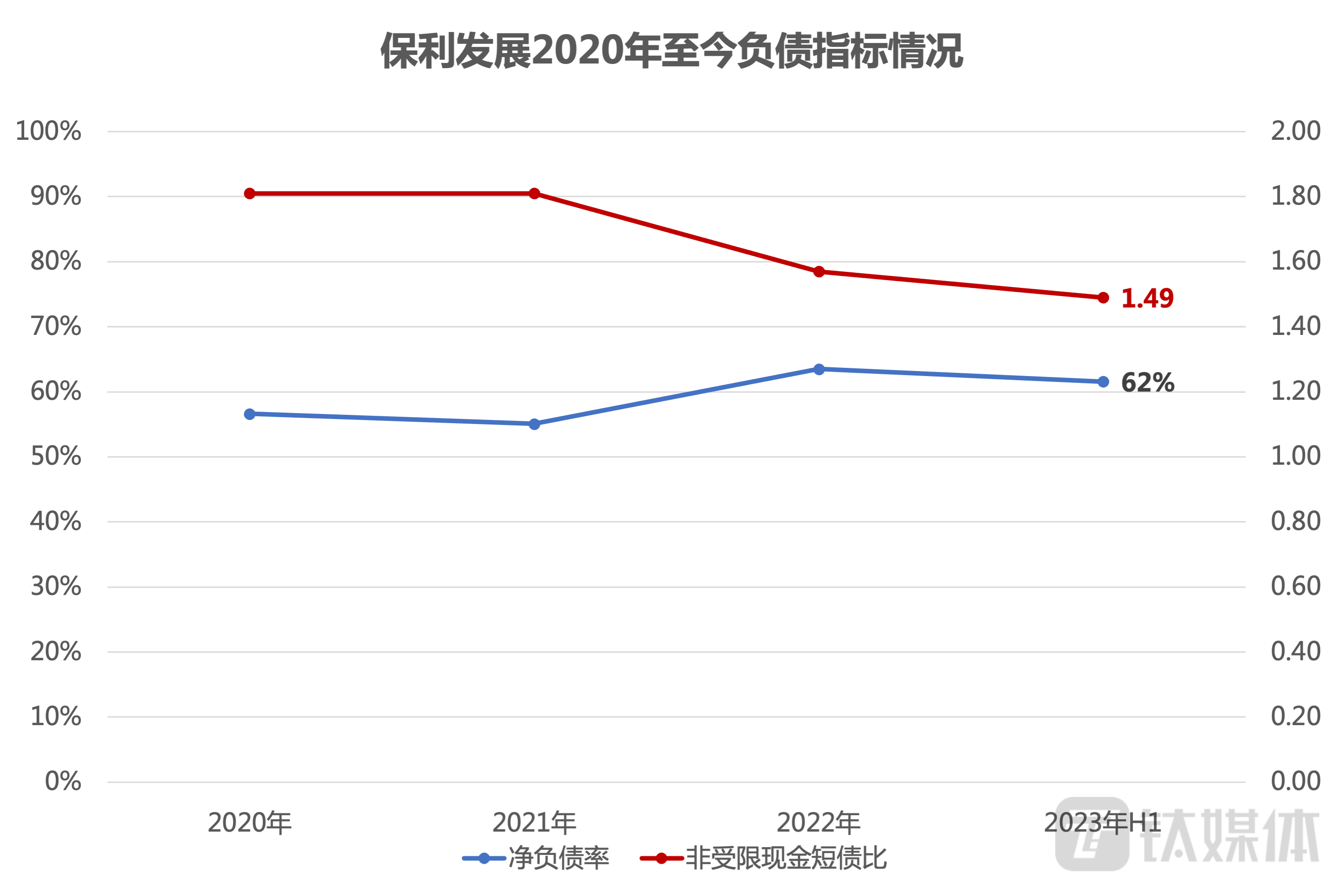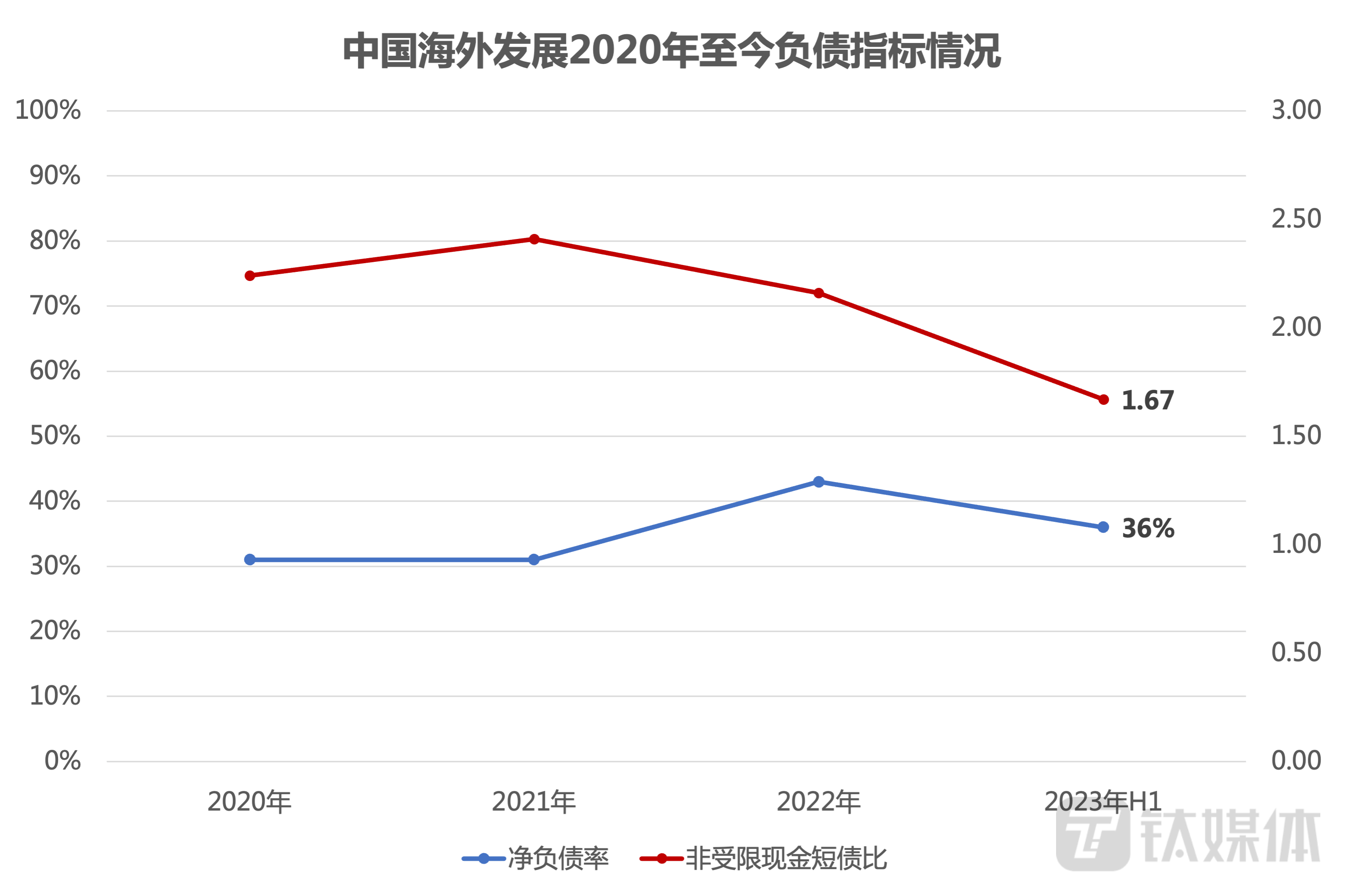 截至2023年上半年,中国海外发展银行结余及现金为1142.1亿元(包括受规管的物业预售所得款为345.2亿元),较年初增长3.5%。扣除受限制现金后的现金短债比为1.67,长短期债务比4.26。净负债率同比下降约3个百分点至36%,加权平均融资成本3.54%,处于行业极低水平。