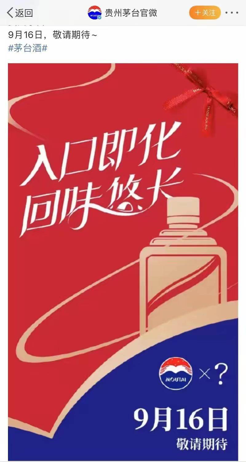 9月13日晚,贵州茅台官微发布了一张意味深长的海报,海报上写着“入口即化、回味悠长”“贵州茅台×?”“9月16日,敬请期待”,暗示继酱香拿铁之后,茅台再推联名新品。