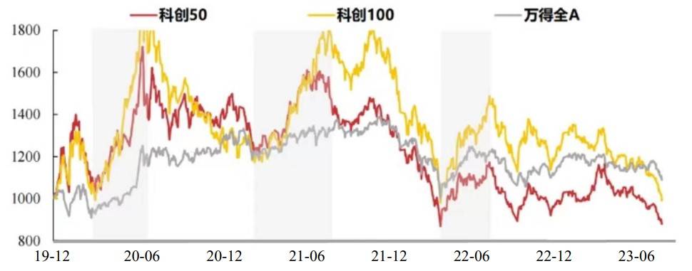 回顾行情历史,2020年-2023年中有三段时间,科创100表现领先全 A 和科创50。