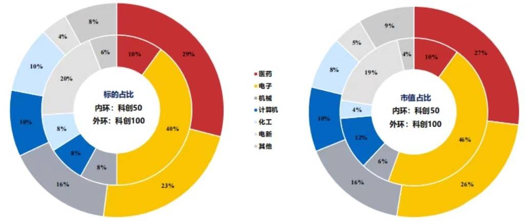 科创100申万一级行业市值占比前三的:医药27%、电子26%、机械16%。