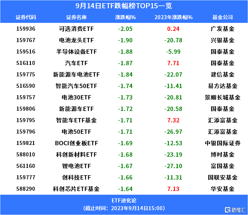电池板块跌幅居前,电池龙头ETF跌1.9%。半导体板块走弱,半导体设备跌1.88%。汽车股表现萎靡,汽车ETF跌1.87%。