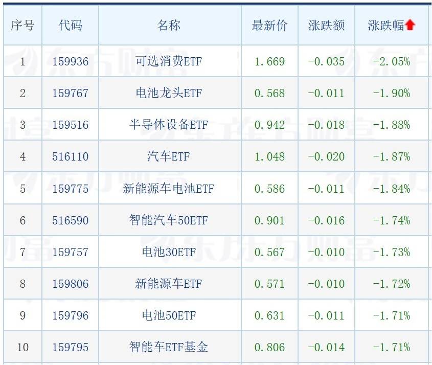 下跌方面,电池、半导体、新能源车等相关ETF跌超1%。