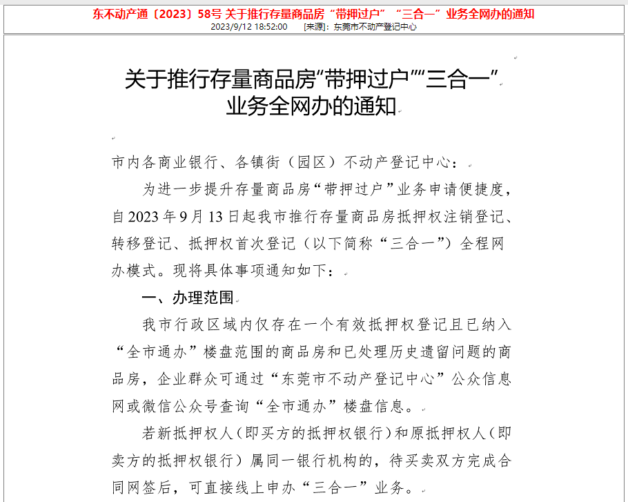 存量房方面也有好消息。9月12日,东莞市不动产管理中心发布的通告显示,自9月13日起推行存量商品房抵押权注销登记、转移登记、抵押权首次登记(简称“三合一”)全程网办模式。