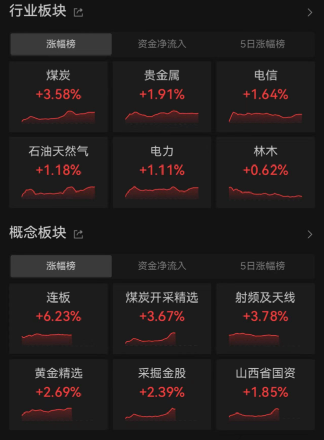 盘面上,煤炭、黄金、电信、石油天然气、电力等品种维持一定热度,但汽车零部件、餐饮旅游等板块跌幅较为明显。