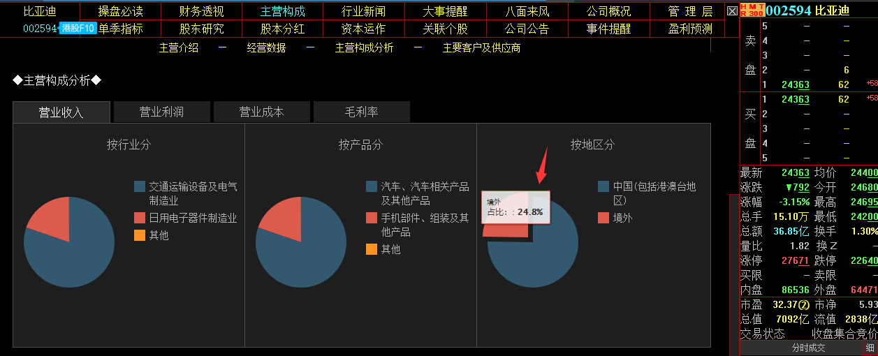不过,比亚迪今天虽然跌得较多,但实际上这个事情要反过来看。因为从比亚迪主营构成来看,其在境外的收入占比接近25%,应该是所有国产车中占比最高的。