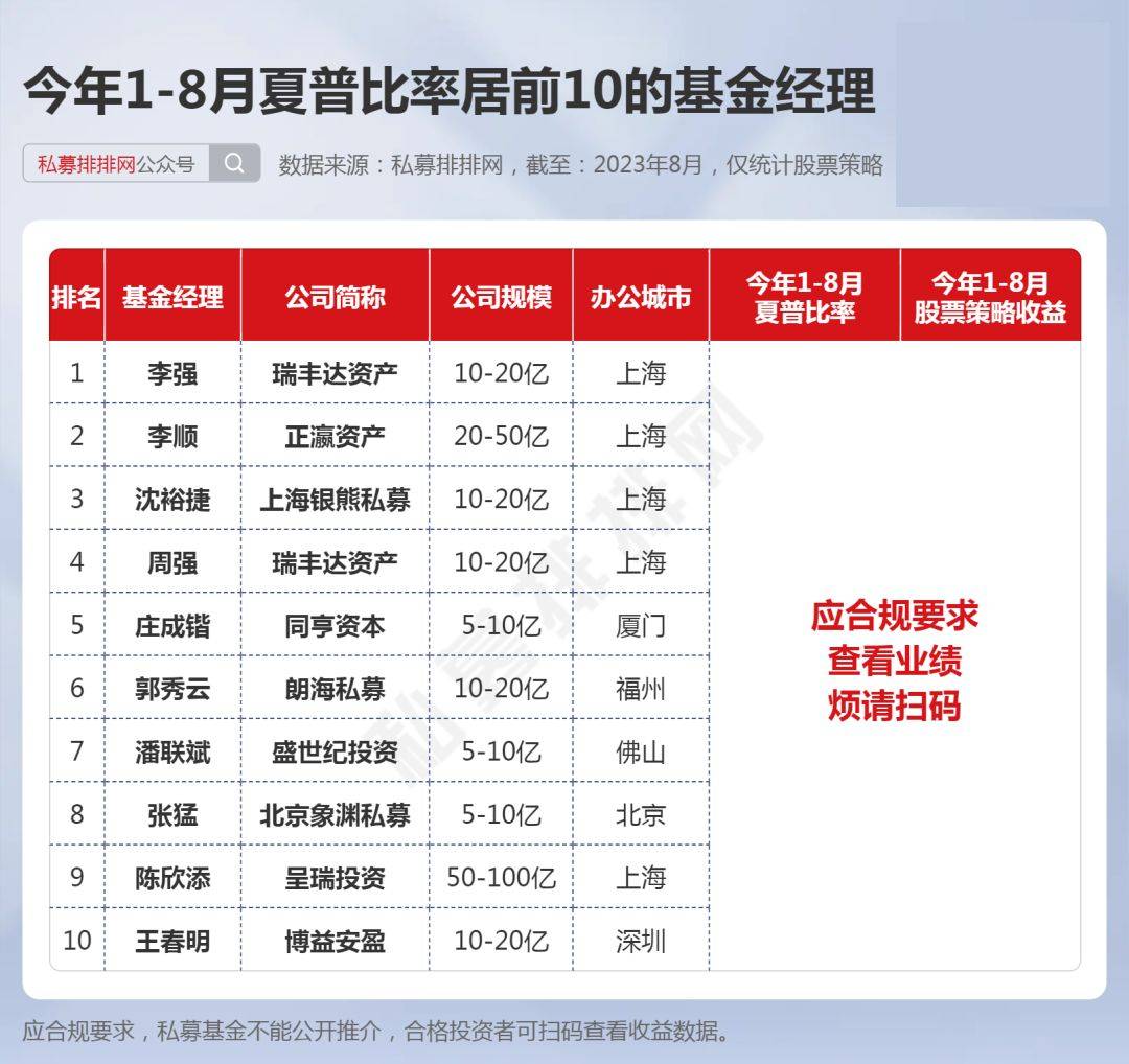 今年1-8月夏普比率居前10的基金经理分别是:瑞丰达资产的李强、正瀛资产的李顺、上海银熊私募的沈裕捷、瑞丰达资产的周强、同亨资本的庄成锴、朗海私募的郭秀云、盛世纪投资的潘联斌、北京象渊私募的张猛、呈瑞投资的陈欣添、博益安盈的王春明。