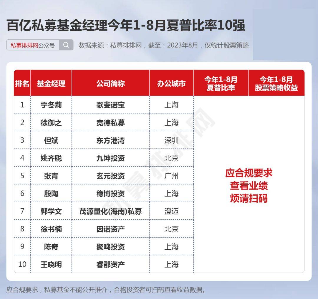 歌斐诺宝的宁冬莉、宽德私募的徐御之、东方港湾的但斌位列百亿私募基金经理今年1-8月夏普比率的前3名。