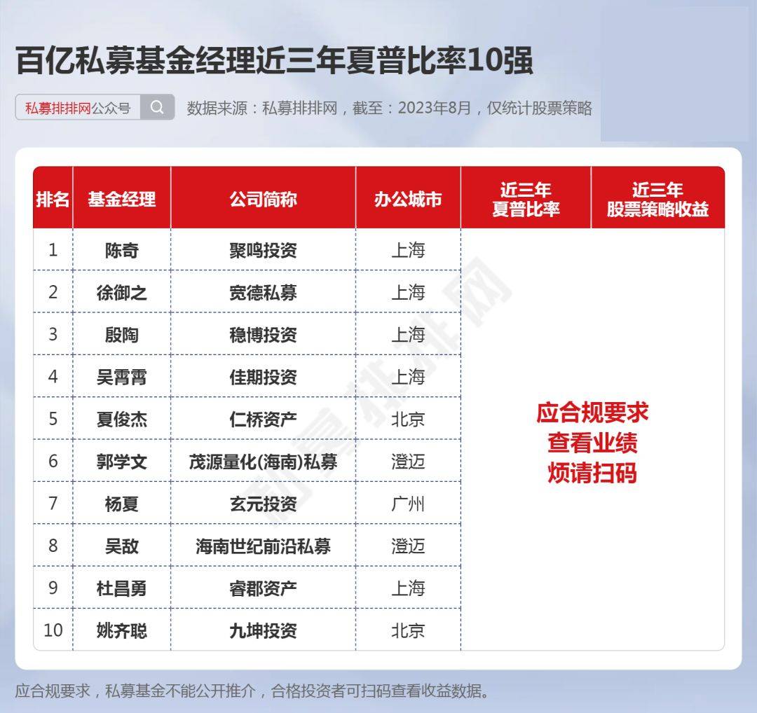 近三年夏普比率居前10的基金经理分别是:汇富联合的张瑞琦、同亨资本的庄成锴、呈瑞投资的陈欣添、华智汇金的高迪、博益安盈额王春明、上海仁和智本的徐翔宇、量魁资产的梁涛、积露资产的杨中现、量魁资产的金枫杰、同温层私募的徐安。