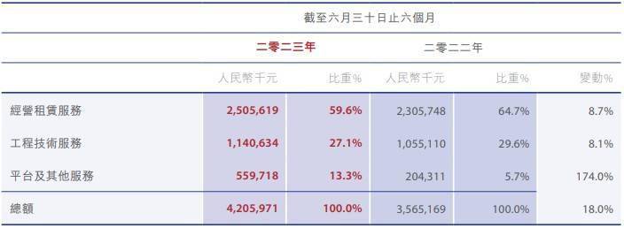 拆分结构来看,宏信建发的收入来源于经营租赁服务、工程技术服务,以及平台及其他服务三大板块。其中,经营租赁服务是公司的第一大业务板块,今年上半年该业务实现收入25.06亿元,占公司总收入的59.6%,规模较上年同期增加了8.7%。