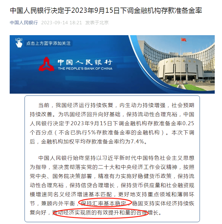 14日晚间,央行发文决定于2023年9月15日下调金融机构存款准备金率0.25个百分点(不含已执行5%存款准备金率的金融机构)。本次下调后,金融机构加权平均存款准备金率约为7.4%。