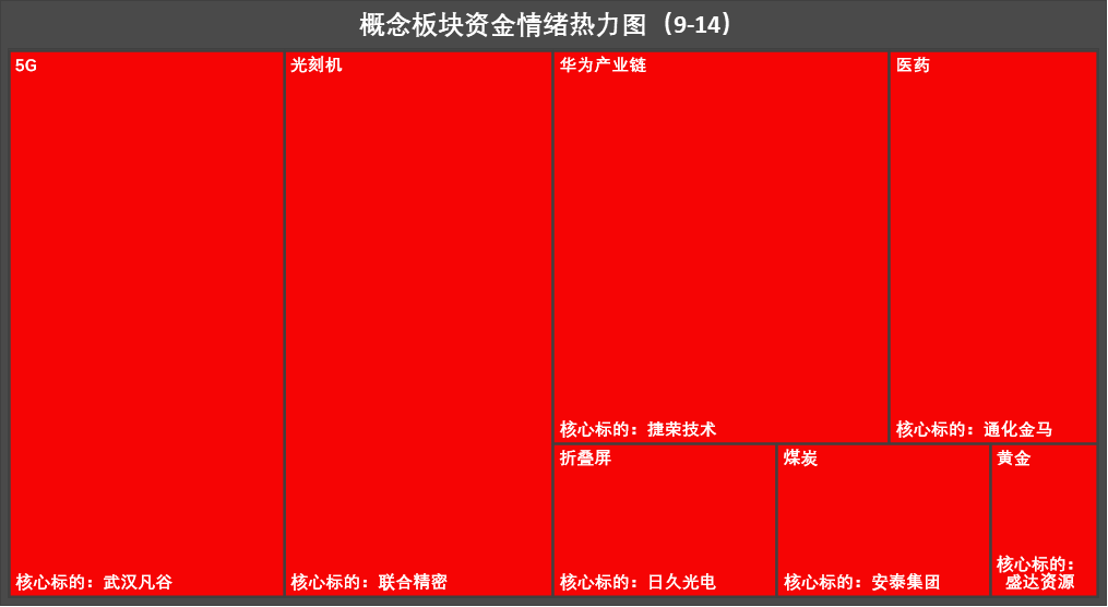 9月14日,大盘延续弱势盘整,创业板指表现更弱,再度刷新年内新低,两市合计成交额6658亿,较上个交易日缩量324亿。行业上看,受华为率先完成5G-A全部功能测试用例驱动,5.5G概念股开盘大涨,在煤炭与黄金期货大涨的背景下,A股相关板块也有所异动。