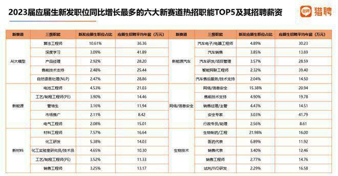 根据猎聘发布的《2023 届高校毕业生就业数据报告》,AI 大模型、新能源这两个行业发布的应届生职位数量,在 18 个新赛道中增速排名第一、第二。