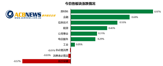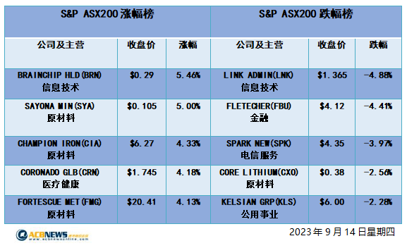 ACBNews《澳华财经在线》9月14日讯 周四,澳洲股市ASX200指数上扬32.6点至7186.5点报收,涨幅0.5%。普通股指上涨至7382.6点收盘,涨幅同样为0.5%。就板块表现而言,11个板块中有8个板块上涨。