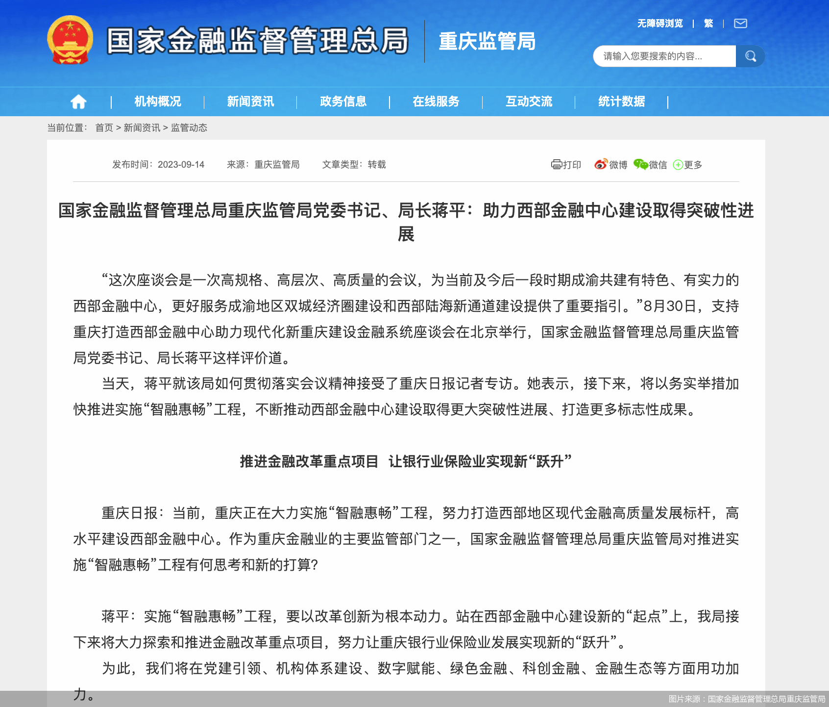 北京商报讯(记者 陈婷婷 胡永新)9月14日,国家金融监督管理总局重庆监管局发布信息显示,8月30日,支持重庆打造西部金融中心助力现代化新重庆建设金融系统座谈会在北京举行,针对重庆保险业在推进落实“惠”方面的打算,国家金融监督管理总局重庆监管局党委书记、局长蒋平在接受媒体专访时表示,完善助企惠民金融服务。如完善“新市民”金融服务,健全第三支柱养老保险,推动城市定制型普惠医疗保险提质扩面,健全多层次社会保障体系等。发展地方优势特色农业信贷和保险,推进多种权属抵押贷款等,推动农业保险“提标、扩面、增品”。同时,深化创新周期性金融产品,推广“保险+期货”试点,帮助涉农市场主体降低农产品价格波动带来的生产经营风险。