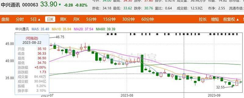 受惠于生成式大模型的火爆,算力板块终于走出结构性的牛市,即便在中兴业绩增长不尽如人意的情况下,中兴中报发布后仅录得两个小幅下滑,随即出现5%的大涨,往前看的则是去年10月初至今年7月初,中兴通讯股价涨幅超过了120%。但在中报发布后其股价波动较大,整体呈下滑趋势。