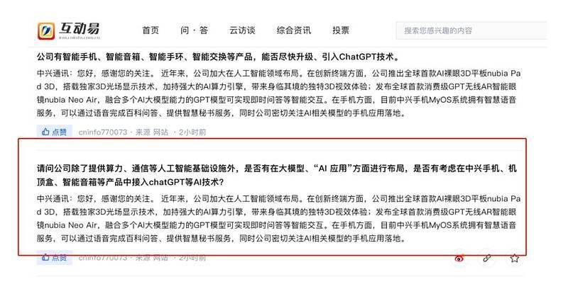中兴在投资者互动平台上表示,中兴已经加大在人工智能领域布局。推出全球首款AI裸眼3D平板nubia Pad3D,搭载独家3D光场显示技术,加持强大的AI算力引擎,带来身临其境的独特3D视效体验;发布全球首款消费级GPT无线AR智能眼镜nubia Neo Air,融合多个AI大模型能力的GPT模型可实现即时问答等智能交互。