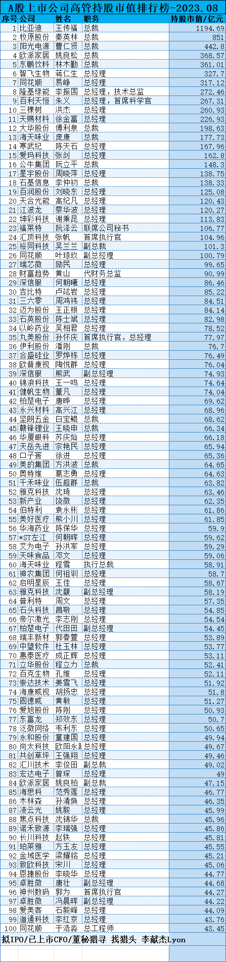 剩下都是TOP4-100名都是43亿-400亿之间的持股市值(身价)的 大佬,