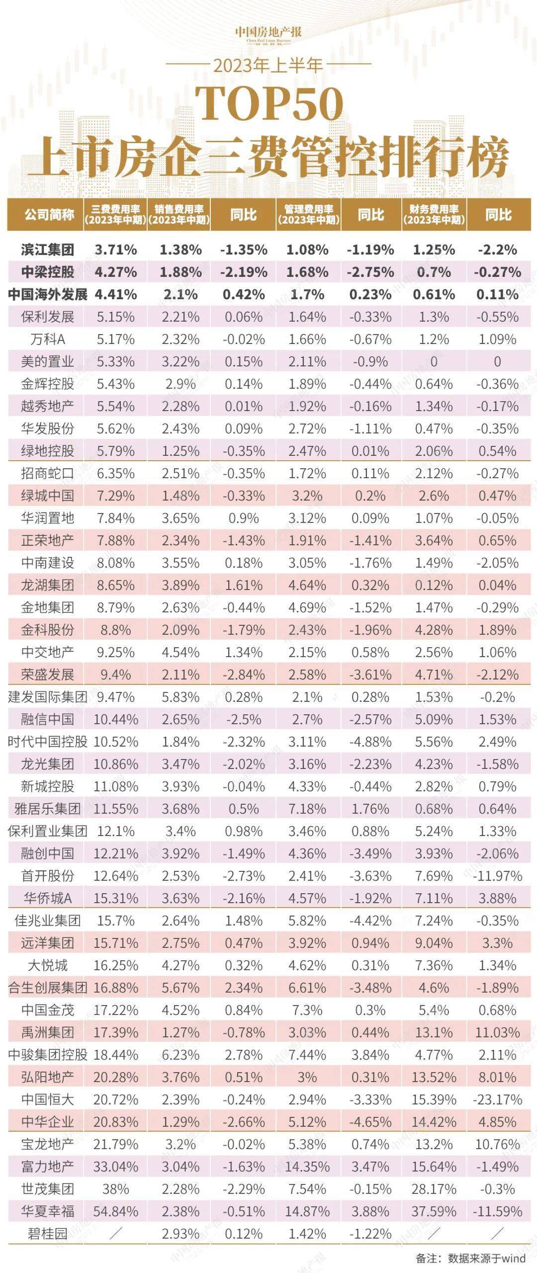 房企间的费用率分化也在进一步加剧。值得注意的是,今年上半年,中海地产不再是TOP50上市房企中三费费用率最低的企业,滨江集团取而代之,上半年的三费费率仅有3.71%;对比之下,华夏幸福上半年三费费用率高达54.84%,二者相差超50%。