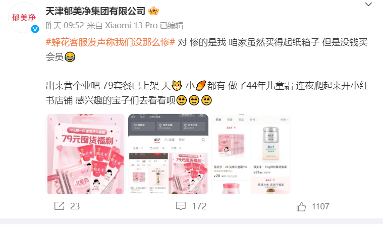 9月14日,郁美净在官方微博发文称,别催了别催了,连夜通网了,毕竟44岁了,不太会玩大家应该不会怪我吧,小红书 、抖音全面入驻。