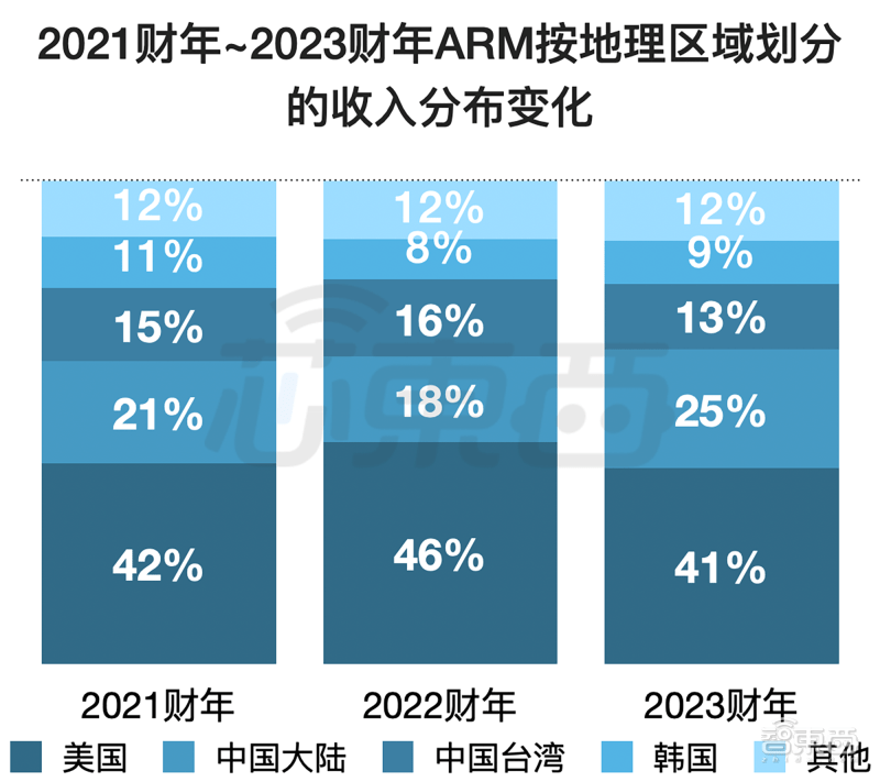 ▲2021财年~2023财年Arm按地理区域划分的收入分布变化