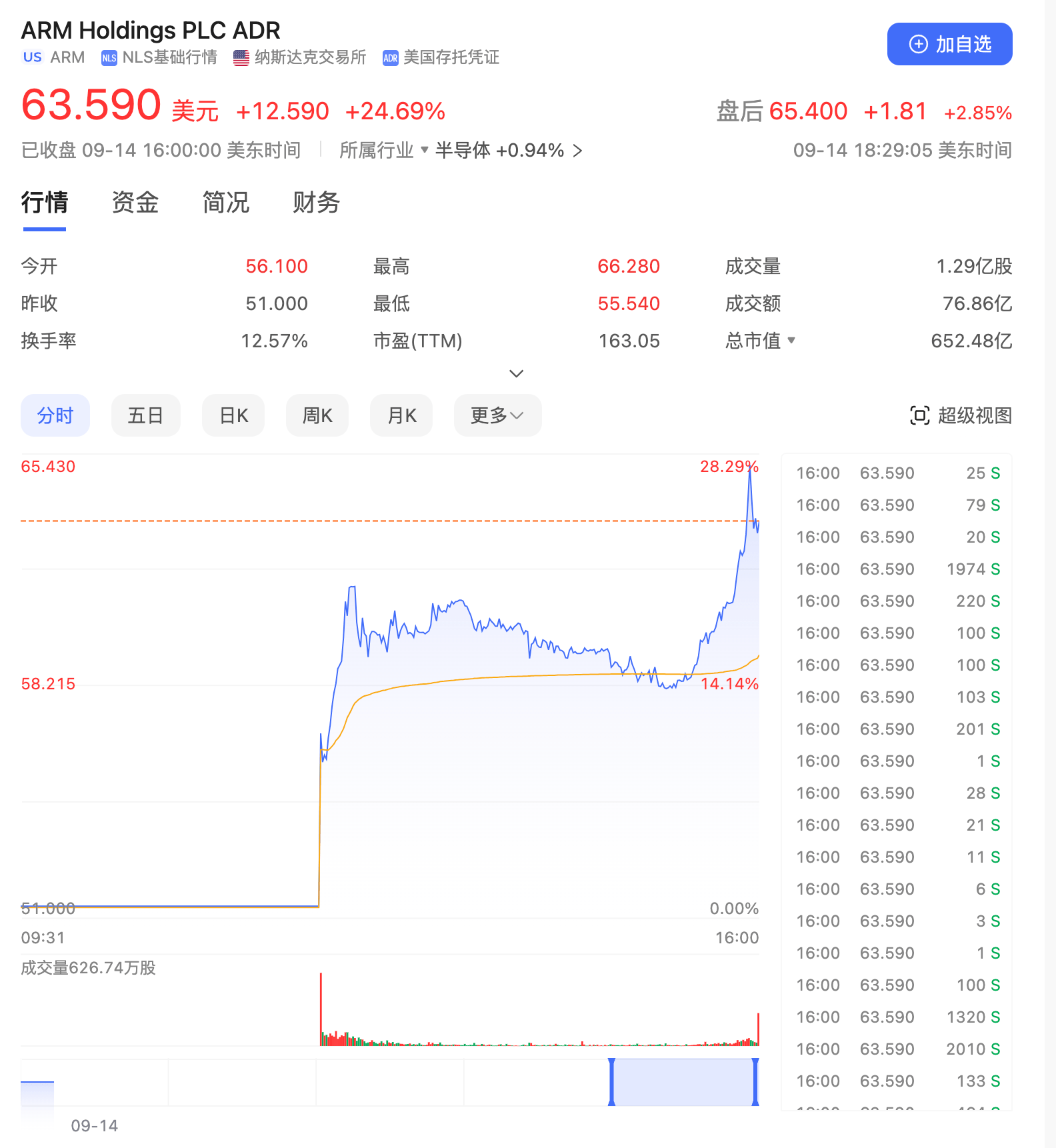 当地时间9月14日, Arm控股有限公司(“Arm”)正式在纳斯达克全球精选市场(Nasdaq Global Select Market)挂牌交易。Arm股票代码为“ARM”,发行价定为每股51.00美元;开盘上涨10%,报56.10美元;盘中一度涨幅达到约30%,冲高至66.28美元。截至首日收盘,Arm股价上涨24.69%,报63.59美元。若以收盘价计算,Arm上市首日市值为652.48亿美元,若包括限制性股票单位在内,Arm完全摊薄后的估值接近680亿美元。