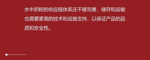 并且水牛奶的消费者主要集中在注重营养、高端人士等特定的消费群体中,还没有形成大众化的消费趋势。所以水牛奶的发展需要各大品牌不断地推动,让消费者提高对于水牛奶源的认知,当然,一个行业的发展也离不开政策上的推动。