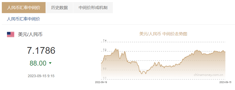 金融界9月15日消息 中国外汇交易中心显示,15日,人民币对美元中间价报7.1786,调升88个基点。
