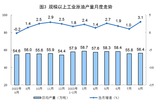 原油生产增速加快,进口加快增长。8月份,生产原油1747万吨,同比增长3.1%,增速比7月份加快2.1个百分点,日均产量56.4万吨。进口原油5280万吨,同比增长30.9%,增速比7月份加快13.8个百分点。