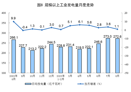 电力生产保持平稳。8月份,发电量8450亿千瓦时,同比增长1.1%,增速比7月份放缓2.5个百分点,日均发电272.6亿千瓦时。1—8月份,发电量58663亿千瓦时,同比增长3.6%。
