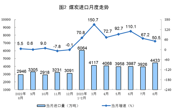 原煤生产有所加快,进口保持快速增长。8月份,生产原煤3.8亿吨,同比增长2.0%,增速比7月份加快1.9个百分点,日均产量1233万吨。进口煤炭4433万吨,同比增长50.5%,增速比7月份回落16.7个百分点。