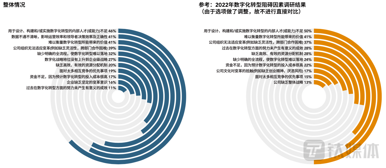 当考虑到阻碍公司从数字战略和技术中有效获得竞争优势的因素都主要有哪些时,45%的受访企业认为是用于设计、构建和实施数字化转型的内部人才或能力不足;同时,还有41%的受访企业觉得难以衡量数字化转型所能带来的价值;排名第三被认为阻碍数字化进程的因素在于数据不通不清晰,影响运营效率和领导者决策效率及正确性,居于阻碍因素的前三位。对比去年和今年的数据结果,可以发现最大的阻碍因素都是数字化转型的内部人才或能力不足,不过去年为占比50%,今年为45%,下降了4%,企业正在为改变数字化转型中的这一最大阻碍做出努力。第二大阻碍因素去年也与今年一致,都为难以衡量数字化转型所能带来的价值,今年占比略有上升。第三大阻碍由去年的“公司组织无法适应变革(例如缺乏灵活性,跨部门合作困难)”(占比37%)变为了今年的“数据不通不清晰,影响运营效率和领导者决策效率及正确性”(占比41%)。可以看到,今年更加困扰企业的是部门之间的数据共通、沟通合作问题,这其实也是跨部门合作困难的基础问题,希望从数字转型中获得竞争优势的企业应该更加关注加强部门间的交流。