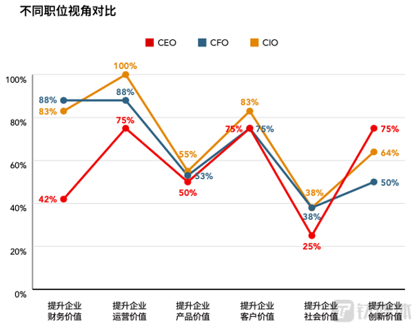 另外一个有趣的数据是,CIO与CFO今年与去年在数字化战略认知上的差异,关于“战略上将自己和竞争对手区分开来”的愿景,去年 CIO与CFO的差距在23%,今年两者的差距缩小到8%;关于数字化转型会让公司“成为一家由技术和数据驱动的公司”,CIO与CFO去年的差距是10%,今年缩小到3%,可见,虽然CFO和CIO对数字化的认知差异仍然存在,但差距在持续缩小。