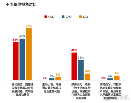 对于企业数字化转型的原因,调研显示,大部分管理层认为公司做数字化转型是为了主动出击、寻求发展,少部分则认为是顺势而为、解决问题。对比不同职位视角,可以发现,84%的CIO认为公司在主动进行数字化转型来解決企业生存、发展问题,但更多的CEO (占比42%)和CFO (占比31%)选择了“顺势而为”,期望数字化解决部分业务问题,可以看出CEO和CFO更加看重部署数字化能力的恰当性、以及和业务的相关性。