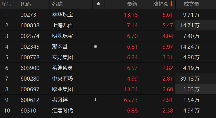 原标题:零售股震荡走高 上海九百涨超5%